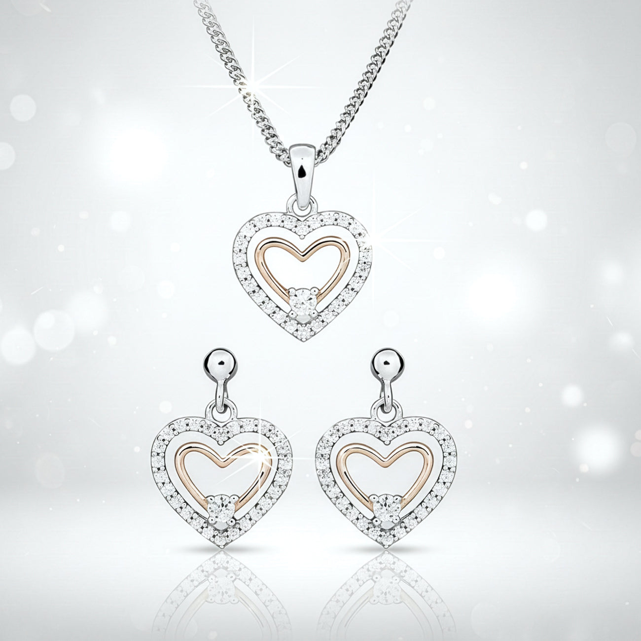 Сребърни обеци Сърца с розово злато и циркони Двуцветна елегантност -